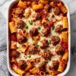 A comforting and hearty Baked Ziti with flavorful homemade meatballs, marinara sauce, and melted mozzarella cheese, perfect for a satisfying family dinner.