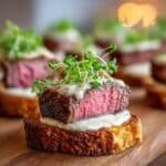 Beef Tenderloin Parmesan Crostini is an elegant appetizer featuring tender seared beef slices served on crispy baguette rounds, topped with a luscious Parmesan cream sauce and fresh herbs. Perfect for entertaining or a sophisticated starter.