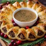 This elegant Beef Wellington Wreath combines tender sirloin, savory mushroom duxelles, and prosciutto wrapped in flaky puff pastry, baked to golden perfection. Served with a rich red wine reduction sauce, it makes a stunning centerpiece perfect for special occasions or festive dinners.