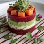 A vibrant and refreshing Mosaic Beet, Mango & Avocado Tartare Stack featuring layers of roasted beets, sweet mango, and creamy avocado. This no-cook, healthy appetizer combines earthy, tropical, and rich flavors in an elegant presentation that's perfect for light lunches or sophisticated starters.