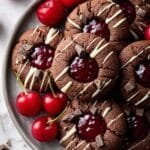 Delight in these indulgent Black Forest Cookies featuring a rich cocoa dough infused with kirsch, filled with luscious cherry preserves, and topped with a drizzle of melted white chocolate. Perfectly soft with slightly underbaked centers, these cookies bring the classic flavors of Black Forest cake into a handheld treat.