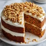This Carrot Walnut Cake is a moist and flavorful dessert featuring finely grated carrots, crunchy walnuts, and a hint of warm spices like cinnamon, nutmeg, and ginger. Enhanced with crushed pineapple and optional raisins, this cake offers a delightful texture and sweetness, perfect for any occasion.