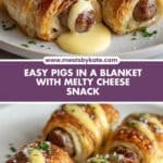 Delicious and easy-to-make Pigs in a Blanket with Cheese combines juicy mini sausages and gooey mozzarella or cheddar cheese wrapped in flaky puff pastry, baked to golden perfection. Perfect as a savory appetizer or fun snack for parties and gatherings.