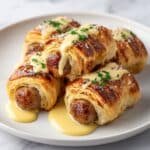 Delicious and easy-to-make Pigs in a Blanket with Cheese combines juicy mini sausages and gooey mozzarella or cheddar cheese wrapped in flaky puff pastry, baked to golden perfection. Perfect as a savory appetizer or fun snack for parties and gatherings.
