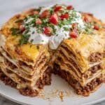 A delicious and comforting Cheesy Tortilla Lasagna Pie featuring layers of seasoned ground meat, creamy cheese, and tender tortillas baked to golden perfection. This easy-to-make dish combines Mexican flavors with classic lasagna styling, perfect for a family dinner or casual gathering.