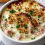 Chicken Cordon Bleu Soup is a creamy, comforting soup inspired by the classic cordon bleu dish. It features tender chicken breast cubes cooked with sautéed vegetables, mushrooms, ham, and melted Swiss cheese in a rich, flavorful broth enhanced with herbs and a touch of white wine. This hearty soup is perfect for chilly days and offers the indulgent flavors of chicken cordon bleu in a warm, cozy bowl.