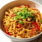This Chicken Lo Mein recipe features tender, thinly sliced chicken thighs stir-fried with fresh vegetables and tossed with perfectly cooked lo mein noodles in a savory, flavorful sauce made from soy sauce, oyster sauce, and sesame oil. A quick and easy dish that's perfect for a satisfying weeknight dinner or when craving classic Chinese takeout flavors at home.