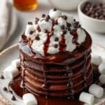 Indulge in these soft hot chocolate pancakes, a decadent twist on a classic breakfast favorite. Made with rich cocoa powder and studded with mini chocolate chips, these fluffy pancakes are topped with melty mini marshmallows and a drizzle of chocolate syrup, making them the perfect treat for any chocolate lover.