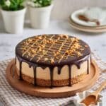 A rich and creamy no-bake Chocolate Peanut Butter Cheesecake featuring a crunchy graham cracker crust, smooth peanut butter cheesecake filling, and a luscious chocolate ganache topping with a decorative peanut butter marble design. Perfect for special occasions or indulgent desserts.