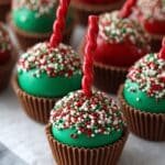 Delight in these festive Oreo Truffles decorated with Christmas-themed toppings. Combining crushed Oreo cookies and cream cheese, these creamy, bite-sized treats are coated in vibrant red and green melting wafers and topped with miniature Reese’s Cups, holiday sprinkles, and licorice candy to resemble cheerful Christmas ornaments. Perfect for holiday parties or gifting, they require no baking and are sure to impress with their rich flavor and charming presentation.