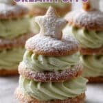 - Assemble the Christmas Tree Cream Puffs: Slice each cooled puff horizontally. Fit a piping bag with a star tip and fill with pistachio whipped cream. Pipe cream onto bottom halves of each size puff. Stack the largest puff on bottom, medium in middle, and smallest on top, piping cream between layers to hold. Press a shortbread star on top of smallest puff. Dust lightly with powdered sugar for snowy effect. Serve immediately or refrigerate until ready.
