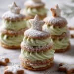 A festive and elegant Christmas Tree Cream Puffs recipe featuring delicate choux pastry filled with rich pistachio whipped cream and topped with buttery shortbread star cookies, perfect for holiday celebrations.