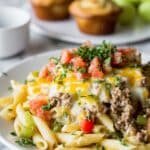 This Creamy Loaded Cheeseburger Alfredo Pasta combines the rich flavors of a cheeseburger with creamy Alfredo sauce, mixed into perfectly cooked pasta. Ground beef, cheddar, mozzarella, Parmesan, and fresh vegetables create a hearty, comforting dish that's perfect for family dinners. Optional toppings like pickles, bacon, and jalapeños add extra flavor and texture.
