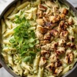 A delicious and creamy chicken pesto pasta featuring tender chicken breast, al dente penne, and a rich sauce made with basil pesto, Parmesan, and mozzarella cheeses. This comforting dish is perfect for a quick and satisfying dinner.