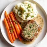 A comforting and flavorful meal featuring tender creamy herb chicken served alongside smooth mashed potatoes and sweet glazed carrots, perfect for a hearty dinner.