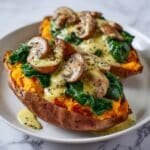 This recipe features irresistibly creamy mushroom stuffed sweet potatoes, combining the natural sweetness of baked sweet potatoes with a savory, hearty filling of wild mushrooms, farro, and aromatic herbs, topped with a tangy vegan aioli. Perfect as a wholesome, flavorful vegetarian meal or side dish.