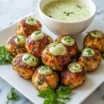 Crispy Salmon Bites with a creamy avocado sauce make a delicious and healthy appetizer or snack. These salmon meatballs are seasoned with garlic, paprika, and fresh parsley, baked to perfection, and served with a tangy avocado and sour cream dip.