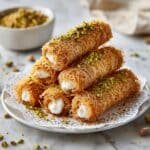 Crunchy Kunafa Rolls are a delightful Middle Eastern dessert featuring crisp fried kataifi dough wrapped around a smooth, creamy ashta filling. These golden rolls are drenched in a fragrant sugar syrup and topped with crushed pistachios, offering a perfect balance of crunch, creaminess, and sweetness that will impress at any gathering.