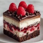 This Dark Chocolate Raspberry Cheesecake features a rich and creamy filling enhanced with high-quality dark chocolate and fresh raspberries, resting on a chocolate wafer crust. Topped with lightly sweetened whipped cream and garnished with extra raspberries and chocolate shavings, it makes an elegant and decadent dessert perfect for special occasions or indulgent treats.