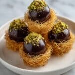 Experience the decadent flavors of Dubai with these luxurious Chocolate Balls featuring a crunchy kataifi base, creamy pistachio filling, and a rich dark chocolate coating. Perfect as an elegant dessert or indulgent snack.