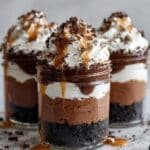 These Dulce de Leche and Chocolate Mousse Jars feature layers of rich bittersweet and milk chocolate mousse, accented with espresso and vanilla, and finished with crunchy chocolate cookie crumbs and whipped cream. A decadent dessert perfect for elegant entertaining or a special treat.