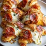Delicious and easy-to-make Gooey Mozzarella Pepperoni Croissant Rolls featuring flaky crescent dough filled with melted mozzarella and savory pepperoni, baked to golden perfection and served with optional marinara dipping sauce.