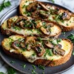 Gourmet Cheesy Mushroom and Garlic Toasts feature sautéed cremini mushrooms combined with a rich blend of cheeses, mayonnaise, sour cream, and aromatic garlic and onion flakes spread over toasted sourdough bread. Broiled until bubbly and golden, these toasts make an irresistible appetizer or snack.