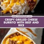 An easy and delicious Grilled Cheese Burrito combining seasoned ground beef, flavorful taco spices, creamy nacho and chipotle sauces, rice, and gooey melted cheeses all wrapped in a warm flour tortilla and grilled to crispy perfection. Perfect for a quick and satisfying lunch.
