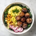 A flavorful and wholesome Herby Chicken Meatball Bowl featuring tender chicken meatballs seasoned with fresh herbs and Parmesan, served alongside roasted spiced sweet potatoes and chickpeas for a nutritious, satisfying meal.