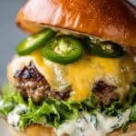 These Jalapeño Popper Turkey Burgers are a flavorful twist on classic turkey burgers, packed with minced jalapeños, smoky spices, and a creamy, cheesy jalapeño popper topping that features cream cheese, Monterey Jack, sharp cheddar, and crispy beef bacon. Perfect for a spicy, satisfying meal served on toasted buns with fresh lettuce and tomato slices.