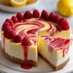 This Lemon Raspberry Swirl Cheesecake combines a creamy lemon-infused cheesecake with a vibrant raspberry swirl, all atop a buttery graham cracker crust. Perfectly baked in a water bath, this dessert offers a luscious texture and a delightful balance of tart and sweet flavors, ideal for special occasions or any time you want a refreshing twist on a classic cheesecake.