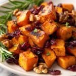 Delight in the warm, autumnal flavors of Maple Roasted Sweet Potatoes with Cranberries and Walnuts. This easy side dish combines tender, caramelized sweet potatoes with the sweetness of maple syrup, the tartness of dried cranberries, and the crunch of toasted walnuts. Perfect for cozy dinners or holiday meals.