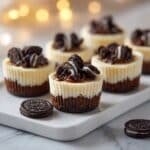 Indulge in these delightful Mini Oreo Cheesecakes topped with creamy Oreo whipped cream. Featuring a crunchy Oreo crust, a smooth and creamy cheesecake filling studded with Oreo chunks, and a luscious whipped cream frosting blended with crushed Oreos, these bite-sized desserts are perfect for parties, celebrations, or any sweet craving.