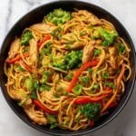 A quick and flavorful one-pan meal featuring tender chicken breasts, stir-fried vegetables, and delicate mei fun rice noodles tossed in a savory blend of soy and oyster sauces, perfect for a satisfying weeknight dinner.