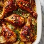 This Oven-Roasted French Garlic Chicken features succulent bone-in, skin-on chicken pieces roasted to golden perfection with a flavorful blend of garlic, shallots, and fresh herbs. Drizzled with olive or avocado oil and basted with a savory white wine and chicken broth sauce, this easy-to-make recipe delivers crispy skin and tender juicy meat, perfect for an elegant yet simple main course.