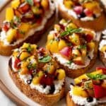 This Peach Bruschetta with Whipped Ricotta is a fresh, flavorful appetizer perfect for warm weather entertaining. Creamy, airy ricotta cheese is whipped with honey and cream, then spread onto crispy, toasted baguette slices and topped with a vibrant peach, red onion, and basil mixture dressed in balsamic glaze and olive oil. The combination of sweet, tangy, and savory flavors makes this dish irresistible and elegant for any occasion.