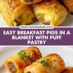 Delicious and easy-to-make Breakfast Pigs in Blanket featuring savory pork sausages wrapped in flaky puff pastry, perfect for a hearty morning treat or brunch snack.