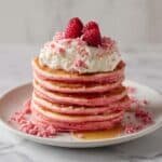 These Pink Galentines Brunch Pancakes combine a beautiful pink hue from freeze-dried pitaya powder with wholesome flours and creamy Greek yogurt toppings. Light and fluffy with fresh raspberries and edible rose petals, this recipe makes a festive, flavorful breakfast perfect for celebrating friendship or any special morning.