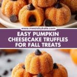 These Pumpkin Cheesecake Truffles are a delightful fall-inspired treat combining creamy cheesecake, pumpkin puree, and warming spices, all rolled into bite-sized sweet balls coated with sugar and topped with chocolate chips for a festive pumpkin look. Perfect for holiday parties or a cozy dessert snack, they offer a rich, smooth texture with a hint of spice and sweetness.