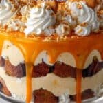 A decadent Pumpkin Spice Cream Trifle layered with spiced cake, creamy pumpkin cheesecake filling, whipped topping, caramel sauce, and toasted pecans, perfect for festive gatherings and holiday desserts.
