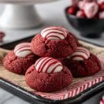 Delightful Red Velvet Blossoms combine the rich flavor of red velvet cake with a creamy cream cheese dough and a festive Hershey's candy cane kiss on top, making these cookies perfect for holiday celebrations or any special occasion.