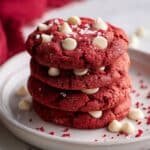 Delight in these soft and chewy Red Velvet Chocolate Chip Cookies, combining the classic rich cocoa flavor with a vibrant red hue and melty chocolate chips for a festive and indulgent treat perfect for any occasion.