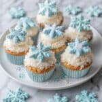 Apply Fondant Decorations: Place a dried fondant snowflake decoration in the center on top of each cupcake to finish.