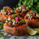 Delicious and hearty Taco Stuffed Sweet Potatoes featuring roasted sweet potatoes filled with a savory mixture of ground beef, sautéed vegetables, black beans, and corn, topped with melted cheese and fresh toppings. This dish combines vibrant Mexican flavors with nutritious sweet potatoes, perfect for a comforting and satisfying meal.