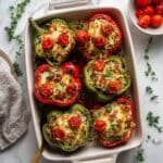 These vibrant Stuffed Bell Peppers are a flavorful vegetarian dish featuring a savory quinoa and brown rice filling, topped with melted mozzarella cheese, and finished with a zesty lemony herb olive oil tomato garnish and toasted pine nuts. Perfect for a wholesome and colorful meal that is easy to prepare and satisfying.