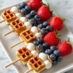 Serve: Serve the skewers immediately to enjoy the crisp waffles with fresh fruit and maple syrup at their best.