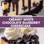This luscious White Chocolate Blueberry Cheesecake features a rich and creamy cream cheese base swirled with a homemade blueberry sauce, all nestled on a chocolate cookie crust. Baked in a water bath for a smooth, velvety texture, it's a beautiful blend of sweet white chocolate and fresh blueberry flavors, perfect for any special occasion or a decadent dessert treat.